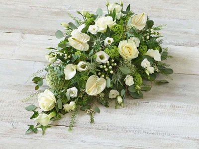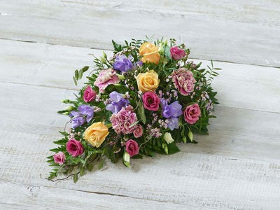 A delicate mix of blooms including roses, lisianthus and scented silvery rosemary. Arranged in a teardrop shape suitable for smaller coffins.