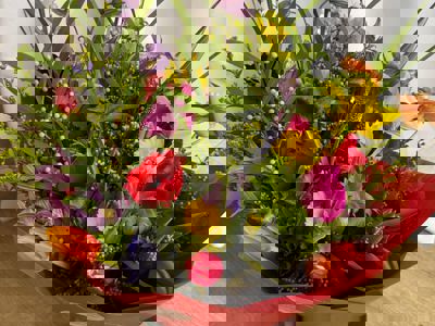 A vibrant bouquet of gorgeous fresh and bright flowers, expertly arranged by a skilled local florist. It could feature hot pink flowers, or blooms in shades of fiery orange or rich yellow.