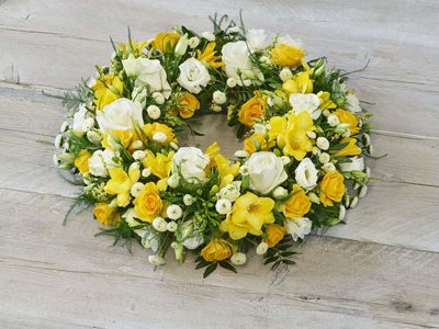 A traditional wreath with a cluster of pretty roses, Various colours available.