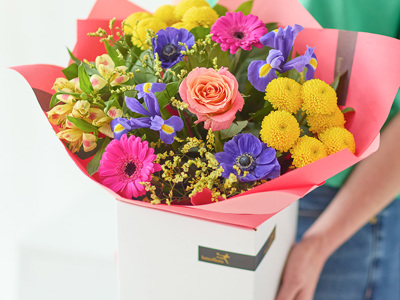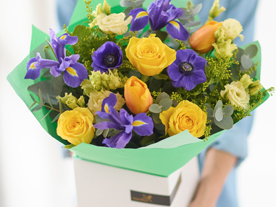 The clue's in the name – A glorious bouquet, perfectly arranged in a fresh, modern style with a spring blue and yellow colour palette, including purple, yellow, lemon, cream and green.