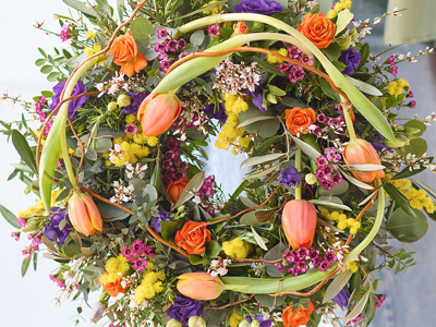 Classic Spring Wreath. Made locally by hand – we'll tell the florist not to include lilies.