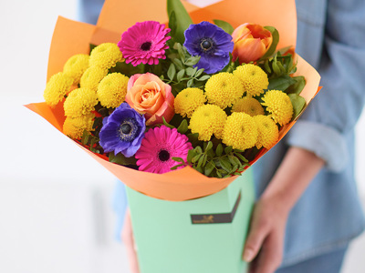 Fresh flowers and foliage in bright colours inspired by new spring growth, think sunshine yellow, tangerine orange, with pops of cerise.