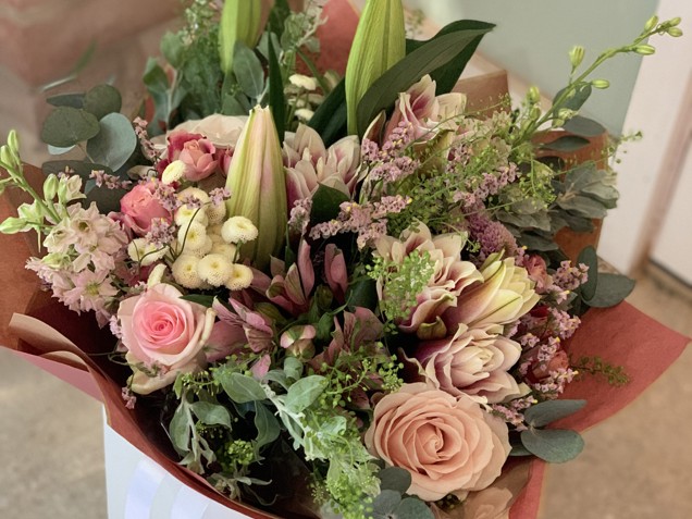 Lots of blends of pink, with a mix of season flower and some bright pink too